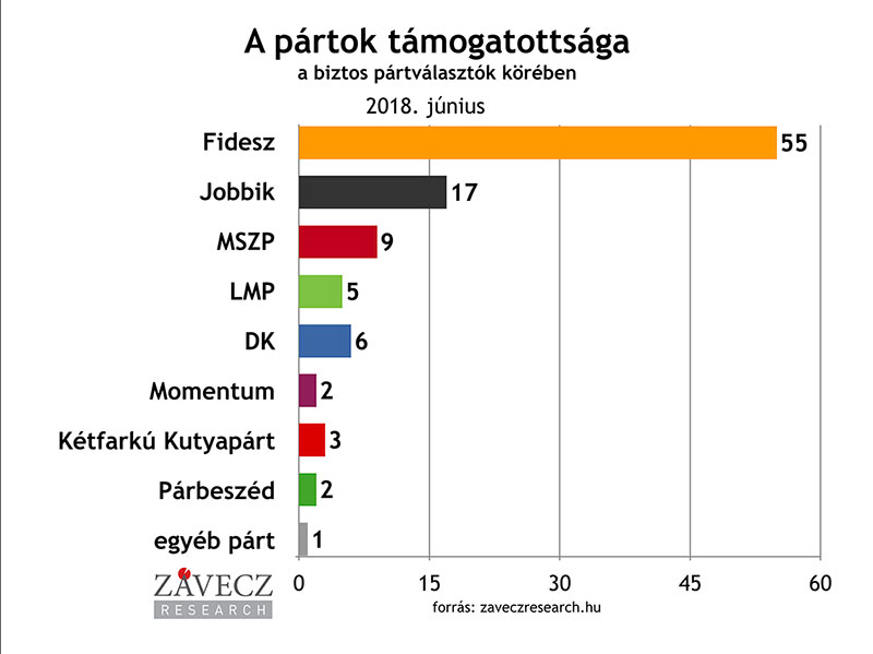 A biztos pártválasztók körében a Fidesz-KDNP 55 százalékot kapna. A második helyen lévő Jobbiknak kevesebb, mint harmadennyi elkötelezett szavazója van – 17 százalékot kapnának. Az MSZP ebben az aktív szavazói körben 9, a DK 6 százalékos, míg az LMP 5 százalékra számíthatna. A bejutási küszöbérték alatt, de említésre érdemes tábora három pártnak van: a Kétfarkú Kutyapárt 3, a Momentum és Párbeszéd 2-2 százalékos. – ezek a legérdekesebb eredményei a ZRI Závecz Research Intézet június első felében, az ország felnőtt lakossága körében végzett közvélemény-kutatásának.