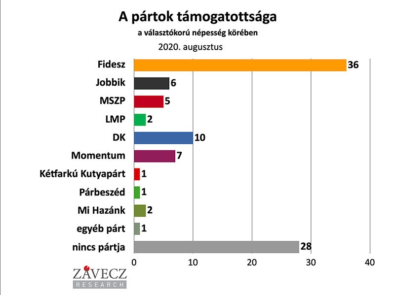 csoportjában a Fidesz 51 százalékos, a második helyen itt is, továbbra is a DK áll, 15 százalékos eredménnyel. A Momentum 10 százalékos támogatói körrel rendelkezik az aktív szavazók körében, míg a Jobbiknak 8, az MSZP-nek 6 százaléka van. Az elkötelezett szavazók körében a Mi Hazánk 3 százalékos, az LMP, a Kétfarkú Kutyapárt és a Párbeszéd 2 százalékos. – ezek a legérdekesebb eredményei a ZRI Závecz Research Intézet augusztus első felében, az ország felnőtt lakossága körében végzett – a márciusihoz hasonlóan – ismét személyes interjúkkal készített közvélemény-kutatásának.